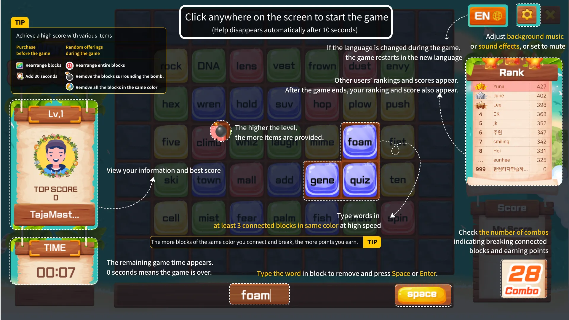 You can enjoy this word game while you improve your typing skills or learn new words and expressions.