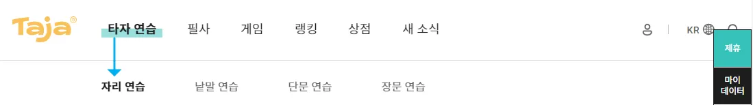 icon on the right side of the website. The menus under νμ μ°μ΅ (Typing practice) are μ리 μ°μ΅ (Key location), λ¨μ΄ μ°μ΅ (Typing words), λ¨λ¬Έ μ°μ΅ (Typing sentences), and μ₯λ¬Έ μ°μ΅ (Typing stories) in order.