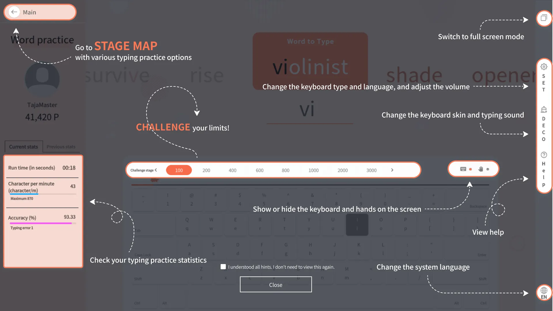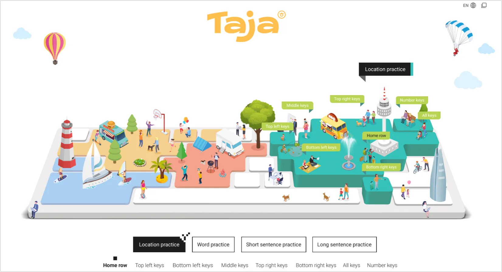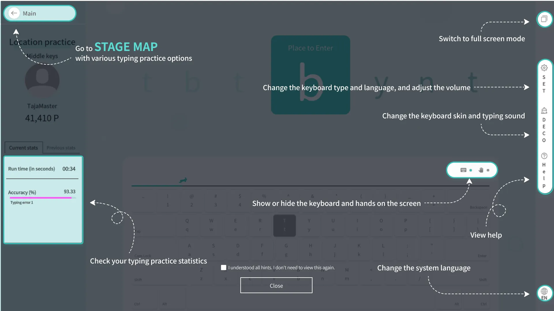 Hover on ‘Typing Practice’ in the menu at the top of the main screen.