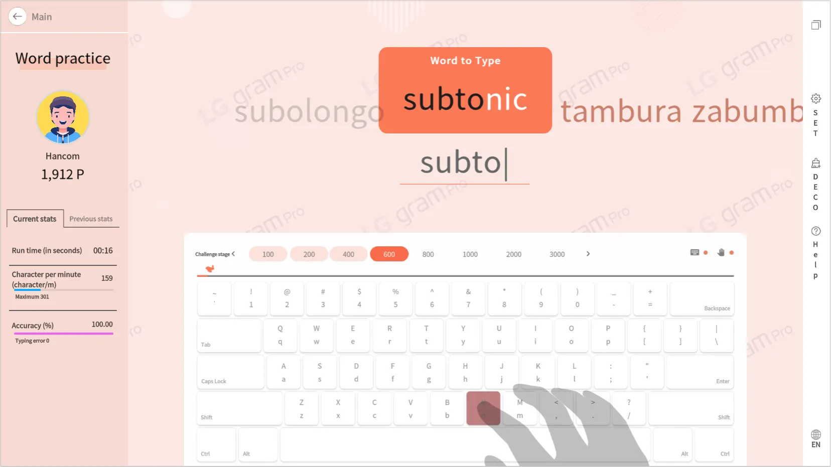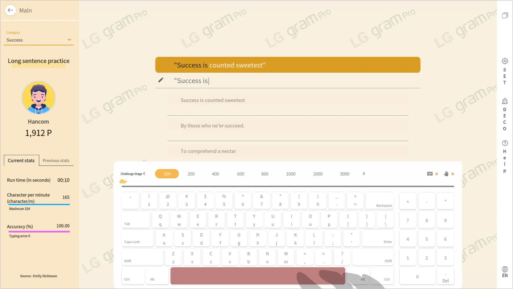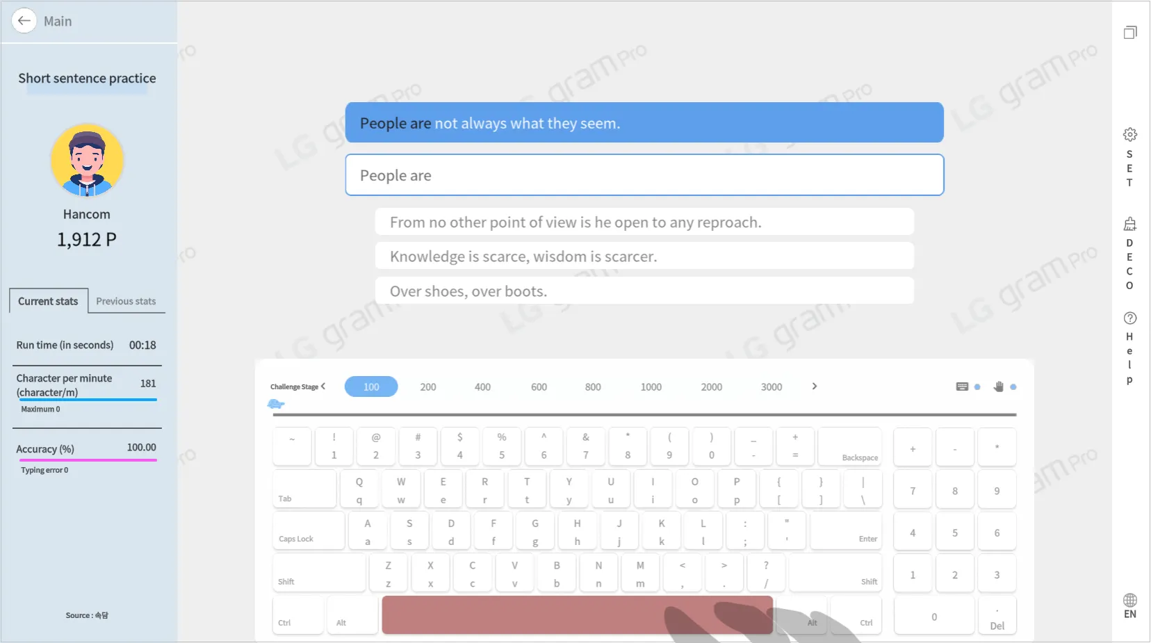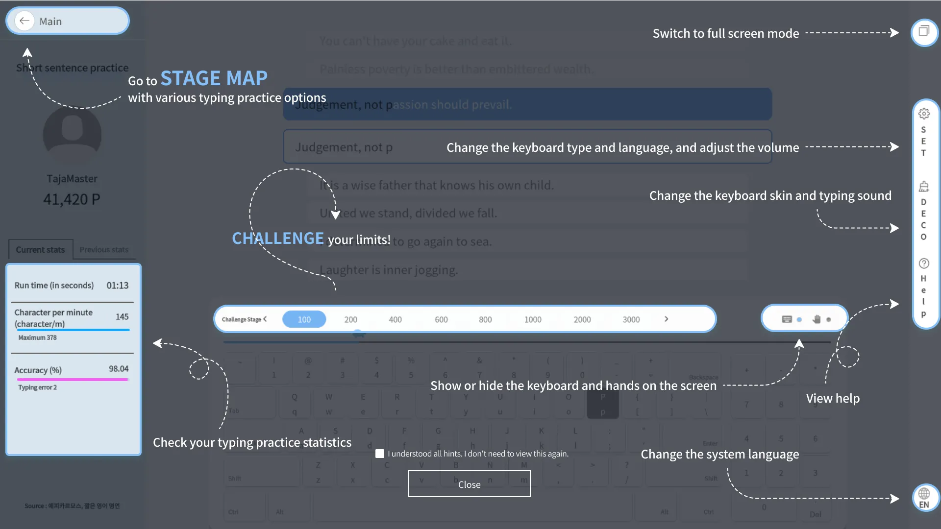 In Hancom Taja’s ‘Typing Practice’, you can enjoy practicing positions, words, short sentences, and long sentences.