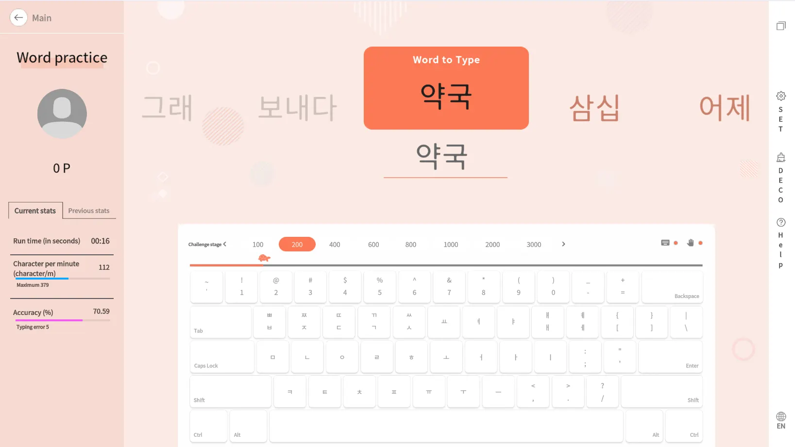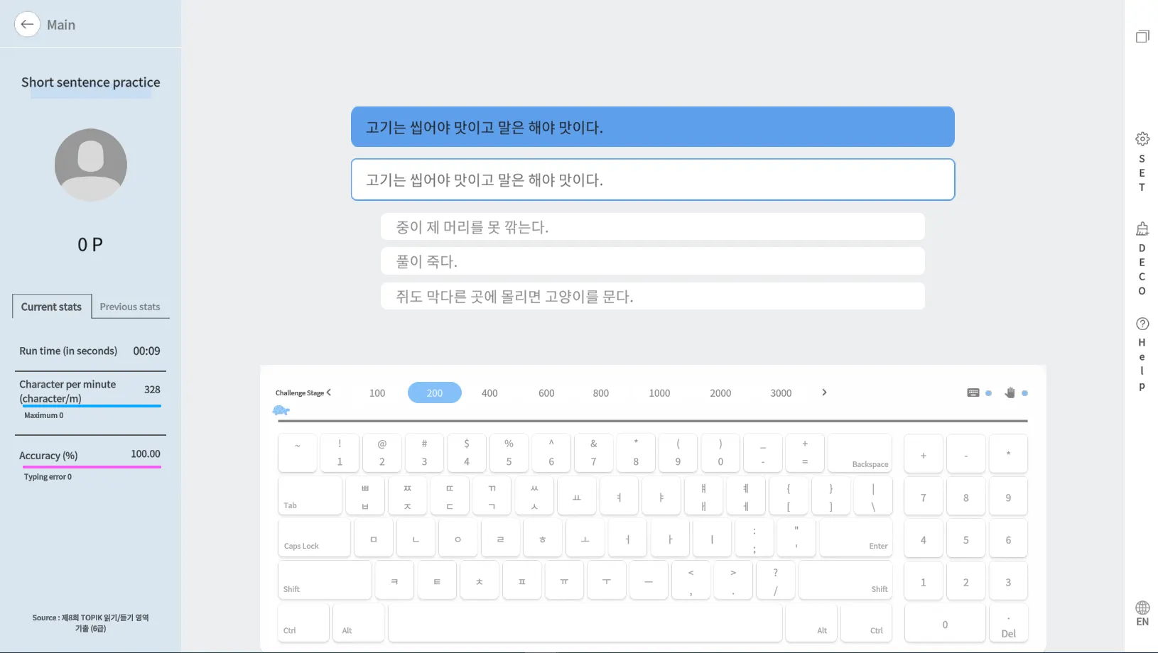 On this screen, you can practice positions, words, short sentences, and long sentences provided by TOPIK.