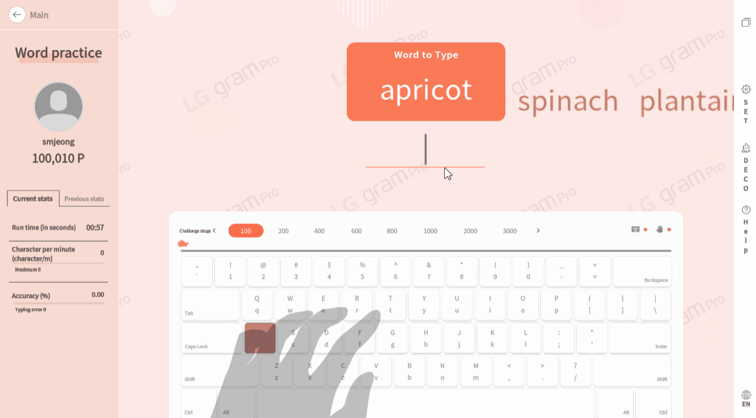 Concentrate solely on the word in the center. After comprehending the key locations, you are ready to type real words to enhance your skills. The virtual keyboard shows which key you're pressing, so you can look at the monitor without checking your physical keyboard. If you make a typo, Hancom Taja marks it in red, so you can easily find and correct it.